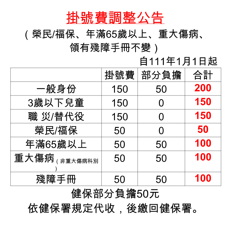 掛號費調整公告